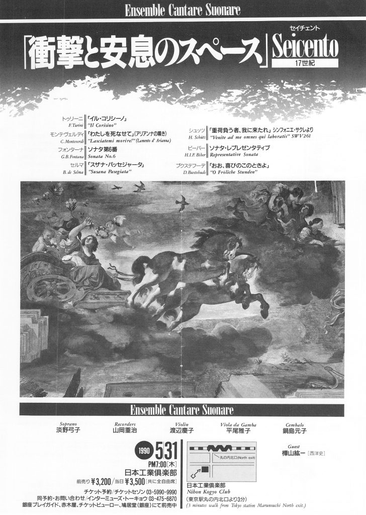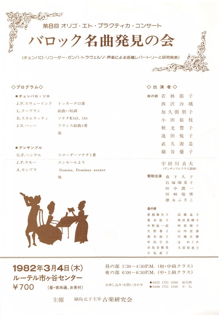 シルト、スウェーリンク、バード、フォルクレなどの作品が並んだ。初めての公開演奏会は1973年6月青山タワーホールで「バッハとその周辺」で、ベーム、フローベルガー、フレスコバルディ、F.クープラン、J.S.バッハの諸作品が演奏され、本邦初演の物も多かった。