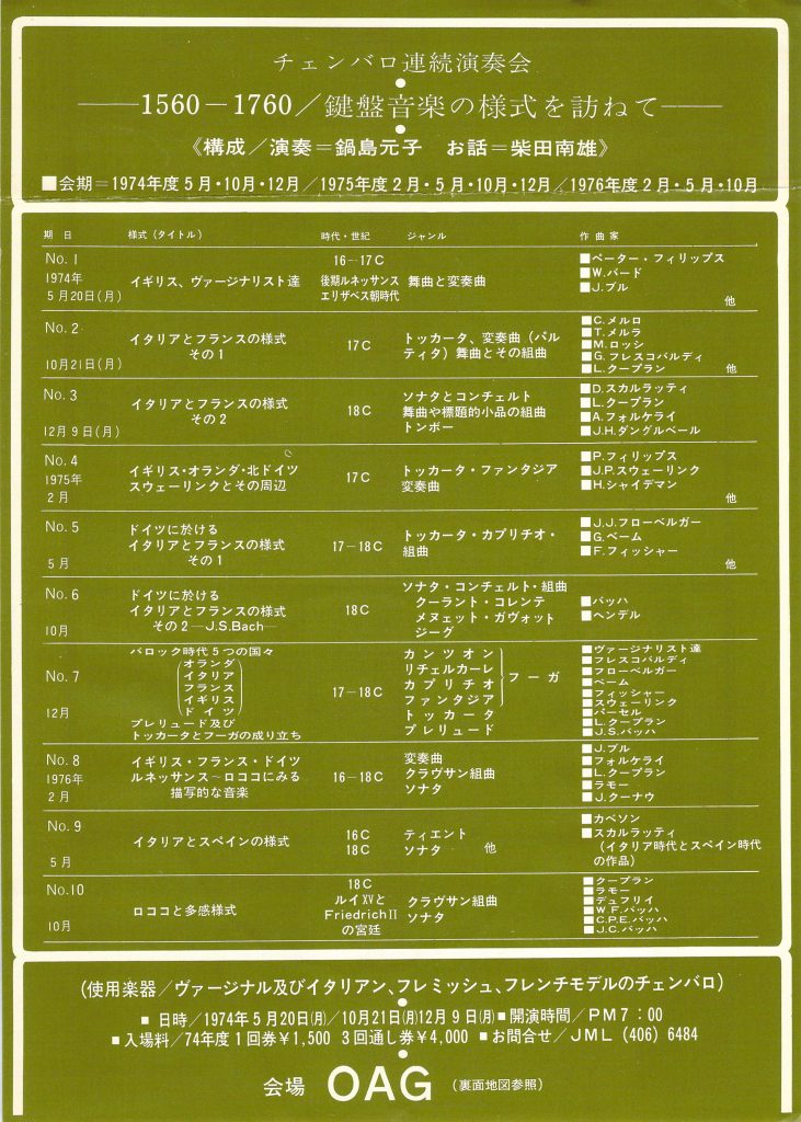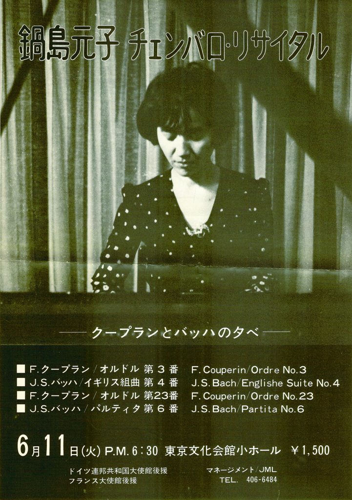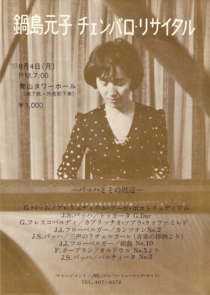 1974年6月、東京文化会館小ホールで「クープランとバッハの夕べ」、そして5月20日からは非常に話題になった10回連続演奏会「鍵盤音楽の様式を訪ねて」が始まる。1974年に4回、1975年には6回という驚くべきシリーズだった。