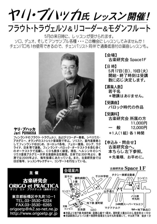 レッスン, 過去のコンサート・講座等 ヤリ・プハッカ氏来日レッスンのお知らせ 2015年5月8日 YojiYamagami 今年も5月17日(日)と19日(火)にレッスンが行われます。 プハッカ氏はフルート・ダムールの研究もされていて、博士号を取っているという事で、そのうちその辺りのお話もして頂けるかと思っています。まだ、レッスン時間に空きがございますので、ご興味があるかたはお知らせ下さい。