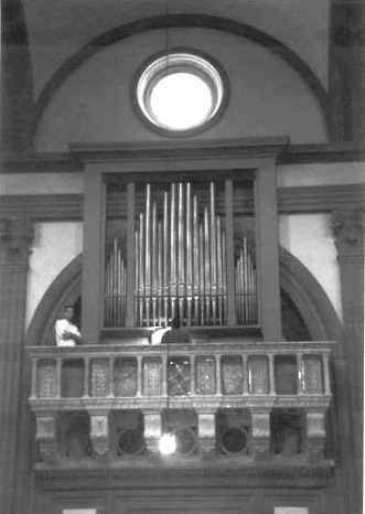 9日朝8:50にホテルロビーでメニケッティ氏と奥様(みつるさん)と会う。一年ぶりの再会。早速、サン・ロレンツォ教会S. Lorenzoへ向う。今日は氏の友人でフィレンツェ在住のオルガニスト、F・ジャンノーニ氏がわれわれに同行して下さる。まず、裏口らしき所から聖堂内部へ、そこでメニケッティ氏のオルガン演奏が開始。天井に吸い込まれていく音に半ばめまいを感じながら、聴き入る。このオルガンは1502年に贈られた物らしい。ミサが始まるまでの少しの時間であったが、至福の時間。上層にある演奏席まで見せていただく。鍵盤数が少ない。これでたった今聴いた演奏をしていたのかと感動。本当にルネサンスのオルガンだ。ふいごが目に入る。「これはやはり電動ですか?」と聞くと「手動に切り替えることも出来る…やってみましょうか」と言う事で、ジャンノーニ氏が急遽ふいご手になる。